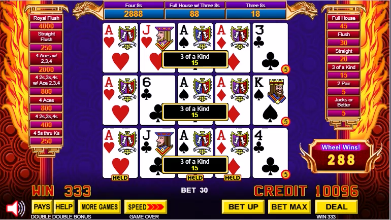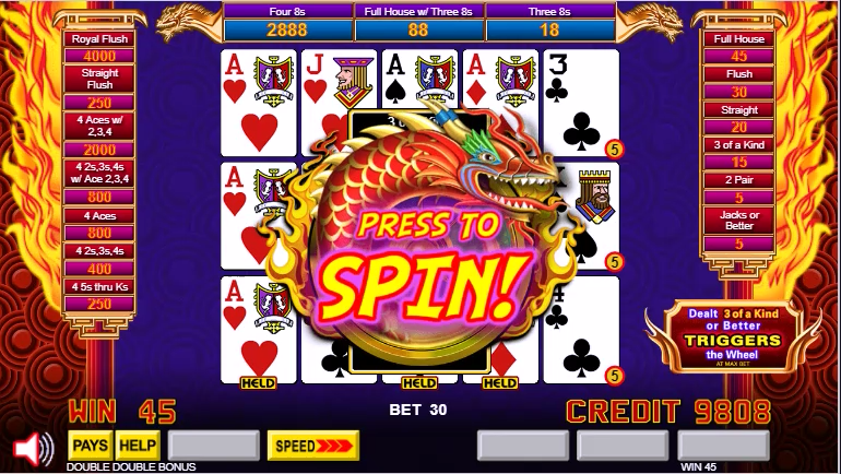 - Lucky 8 的 Wheel Poker 玩起来就像传统的多玩视频扑克一样,我认为读者已经很熟悉了,只是增加了奖励功能,如下所述。