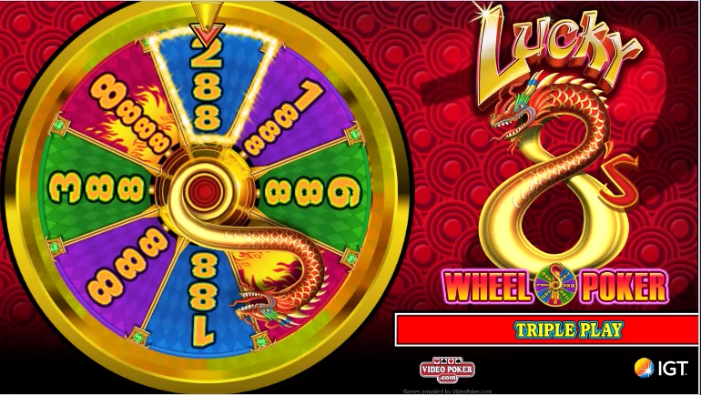 Lucky 8's Wheel Poker 是 IGT/Action Gaming 推出的一款视频扑克游戏。它的玩法与传统的 3 人或 5 人视频扑克类似,每线投注 1 至 5 个硬币。如果玩家每线投注 10 个硬币,即可激活奖励功能。启用奖励功能后,如果发到三张同点牌或更好的牌,即可获得额外旋转机会,赢得额外奖金。