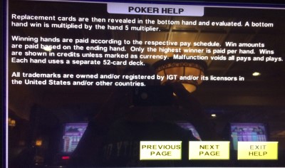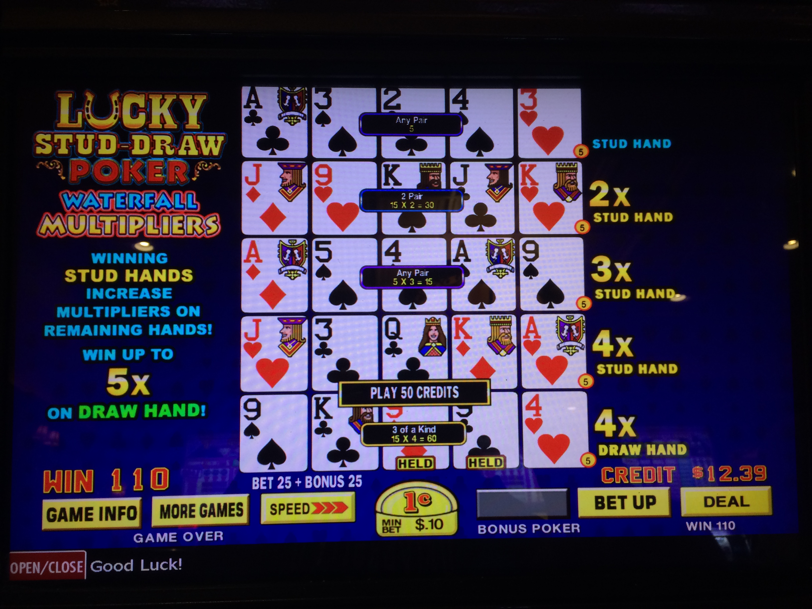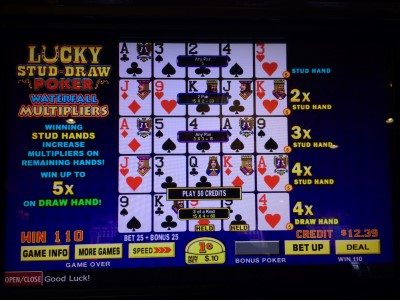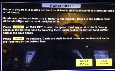 玩家无法控制梭哈牌,而且它们会从不同的牌堆中发牌,因此其策略与传统的视频扑克完全相同,包括特定的换牌游戏和赔率表。我于2017年5月31日在拉斯维加斯的Palace Station酒吧观看了这场游戏。它位于爱尔兰酒吧附近。
