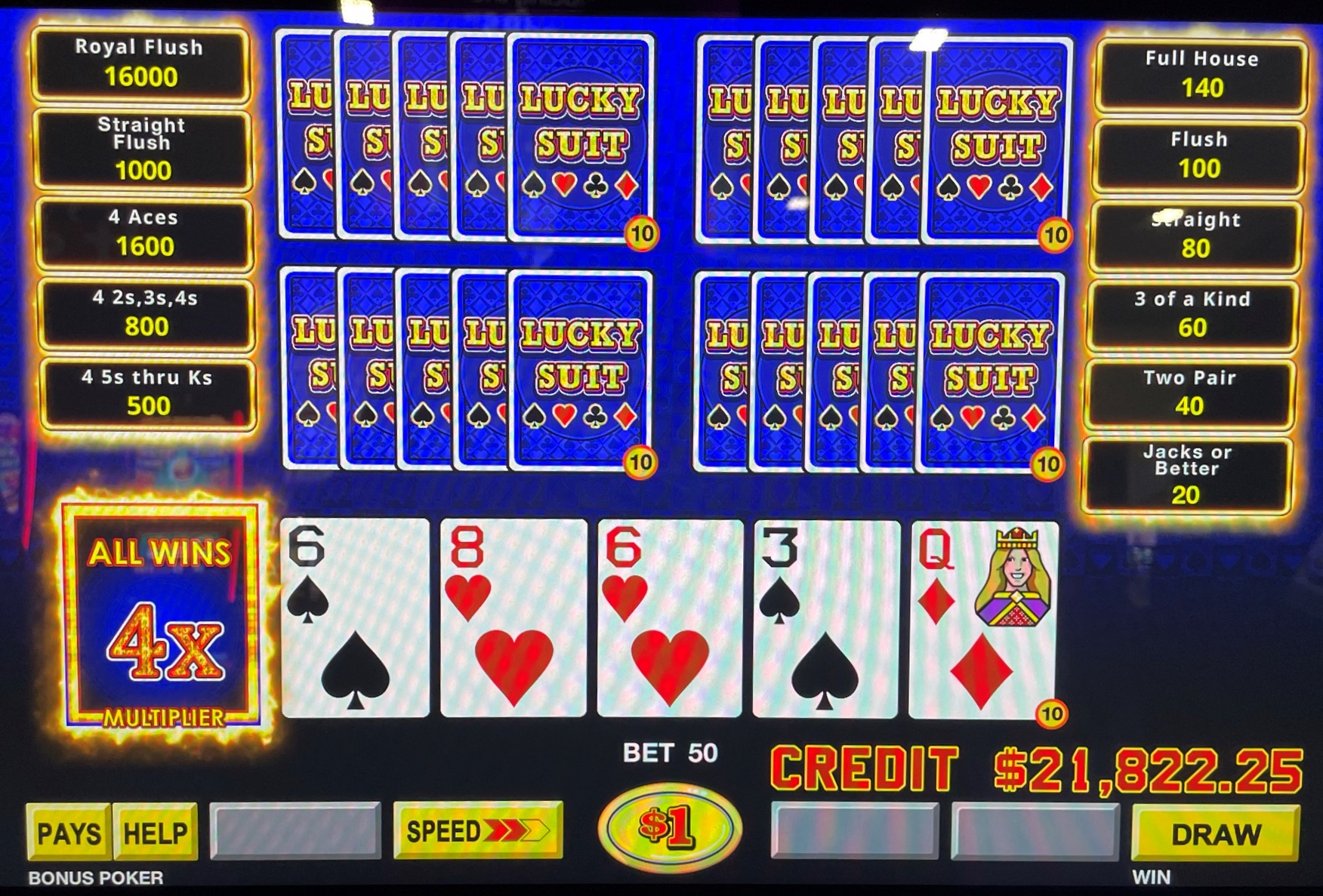 幸运花色是视频扑克的一种变体,如果发出的第一张牌与“幸运花色”匹配,则会奖励乘数。乘数取决于第一张牌的点数。