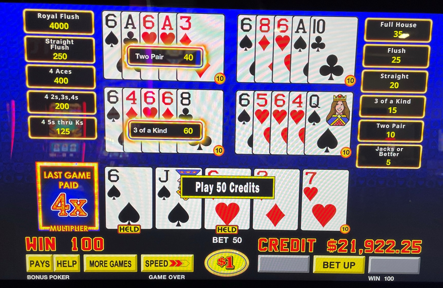 我拿到了一对六。注意,即使拿到黑桃六,也无需保留乘数。一手牌升级为两对,另一手牌升级为三条。通常情况下,这两手牌分别赢得 10 个和 15 个筹码。但是,由于乘数为 4 倍,我的总奖金为 4×(10+15) = 100。