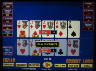 在上面的例子中,发牌后我手里只有方块J。第一次抽牌时,它变成了一对J,赔付5个点数。之后我继续持有这对,第二次抽牌时,它变成了两对,赔付10个点数。我的总“赢”额是5+10=15个点数。因为这是我的初始赌注,所以我实际上赢了。