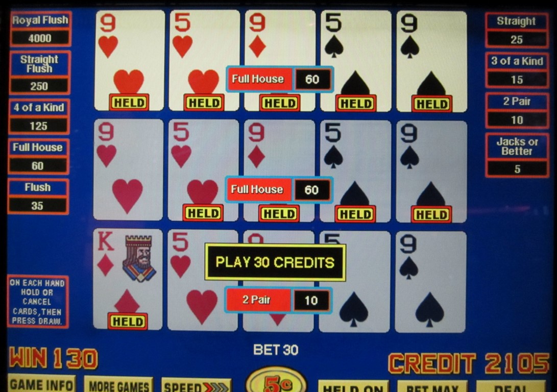 这手牌,发牌后我手里唯一一张牌是方块K。第一次抽牌,它变成了两对,赔付10个积分。之后我又拿到了两对,第二次抽牌,它变成了葫芦,赔付60个积分。第三次抽牌,我拿到了葫芦,同样赔付了60个积分。我的总“赢”额是10+60+60=130个积分。我的初始投注是30个积分,所以盈利是100个积分。