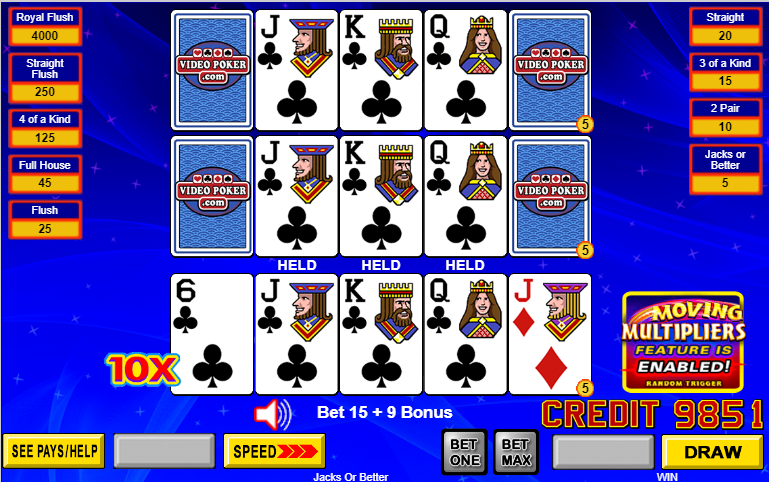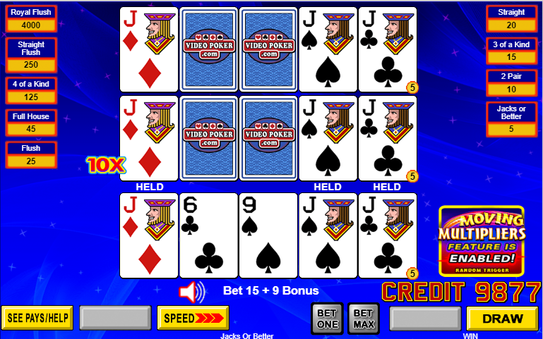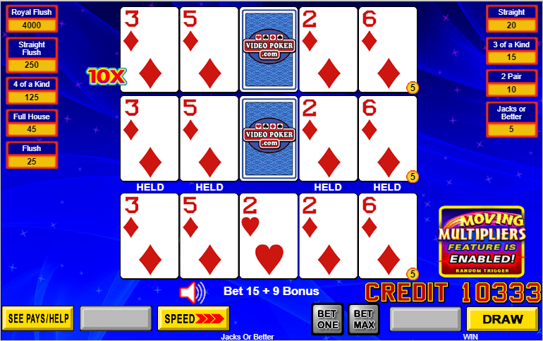 - 移动乘数是传统3次、5次和10次玩法的多重玩法视频扑克机新增的功能。假设读者已经熟悉多重玩法扑克的运作方式。