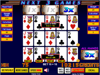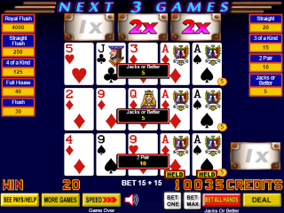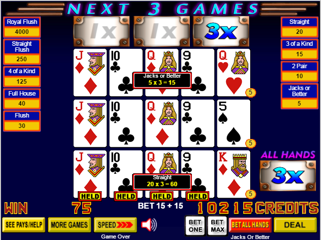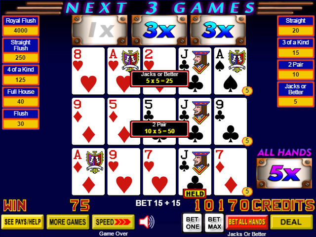 我的顺子升级为一对高牌和一对顺子。基于3倍乘数、每线下注5个硬币、顺子基本赢利4分、高对基本赢利1分,总赢利为3×5×(1×1 + 1×4)= 75。