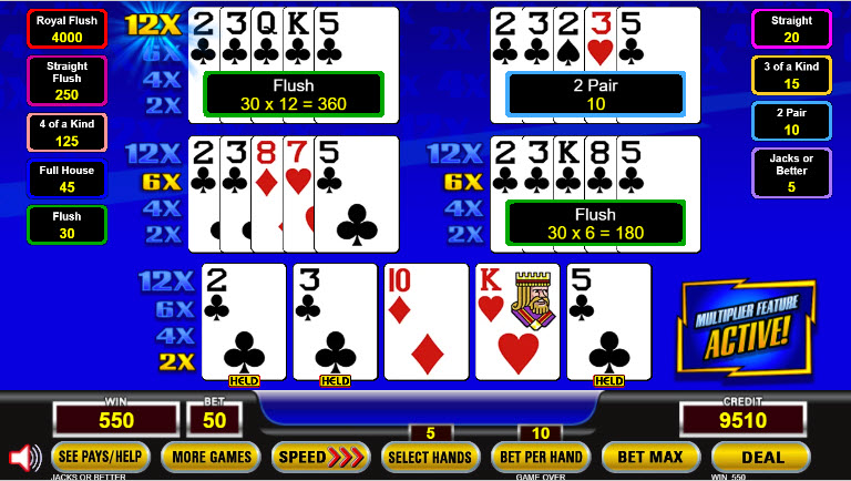 - 倍数提升是传统多玩家视频扑克游戏新增的可选功能。它提供 3 倍、5 倍和 10 倍的玩法。