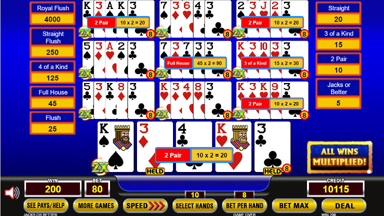 在上图中,发牌后立即获得了2倍的乘数。抽牌后,我拿到了四张两对、一张三条和一张葫芦。乘数之前,这些牌的赔率分别为10、15和45。因此,我这手牌的总赔率为2*(4*10 + 15 + 45) = 200。
