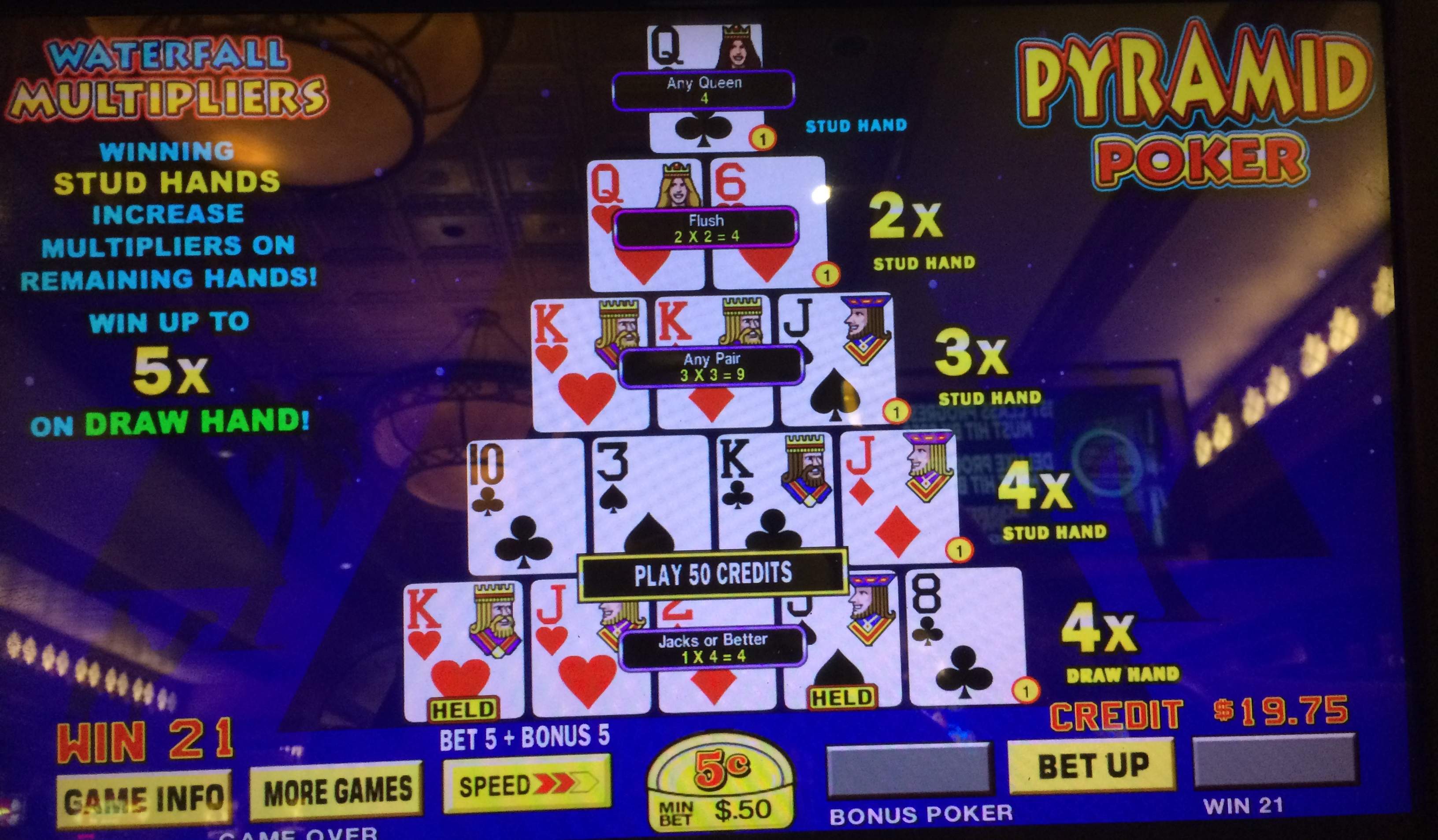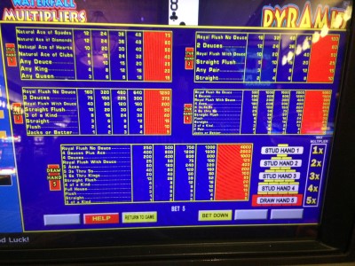 金字塔扑克是IGT推出的一款视频扑克变体。它以五张牌的三角金字塔为底,玩法类似标准视频扑克。顶部四个级别是随机的,并根据公布的赔率表支付点数和倍数。