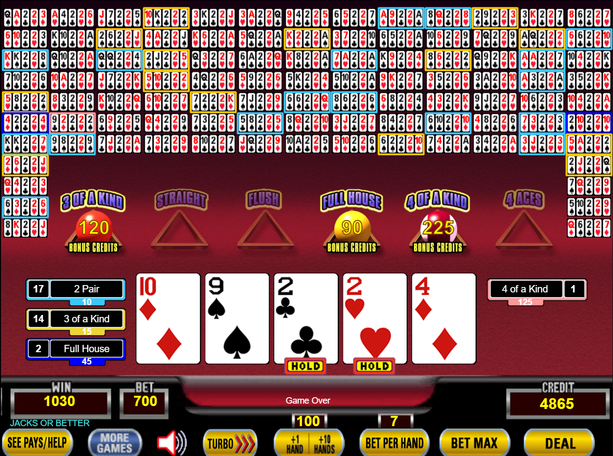 在这个例子中,我玩的是100局9-5 Js或Better,手里有两张2。这是我抽牌后的情况: