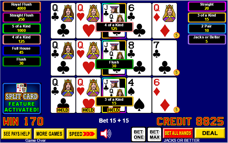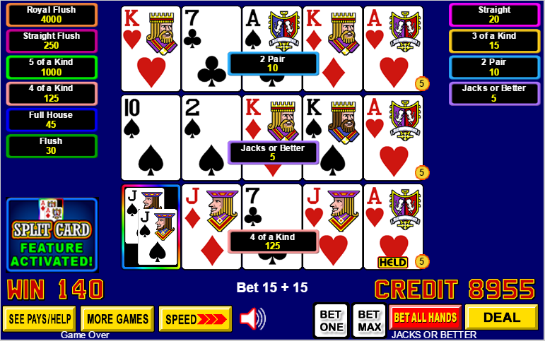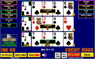 分牌扑克是IGT推出的一款视频扑克游戏,两张牌可以占据一个位置。这样更容易组成高赔付的牌型。分牌总是同花色的,并且包含相同点数或连续点数。要启用分牌功能,玩家必须加倍下注。额外下注需要支付手续费,不会增加任何赢利金额,但会在赔付表中增加一张五条。