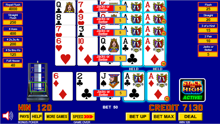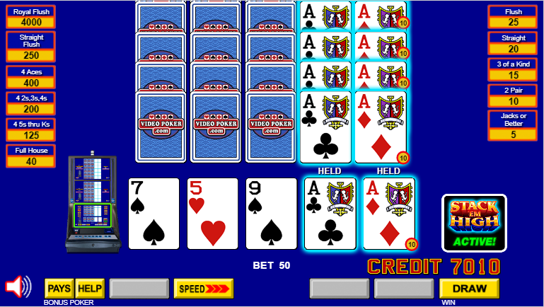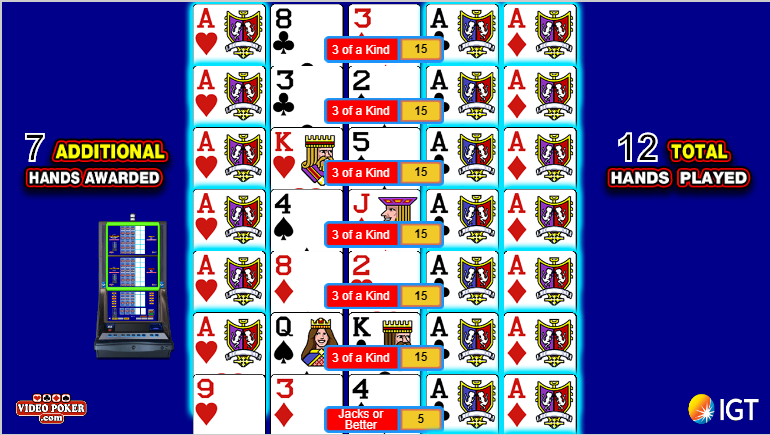 这张截图里,我拿到了两张A,而且我手里还拿着。请注意,这张截图是在VideoPoker.com错误地没有为玩该功能的玩家提供赔付表加成时截取的。