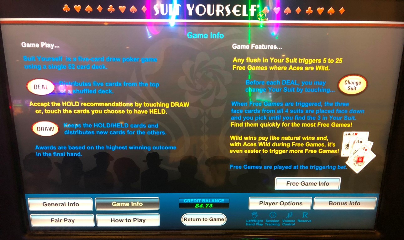 Suit Yourself 是 U1 推出的一款视频扑克游戏。游戏的核心是玩家选择一种花色,如果拿到该花色的同花,即可进入奖励回合,其中 A 为百搭牌,且赔率表不变。此功能主要通过严格的赔率表来实现,其中最低赔率的牌型是一对 A。