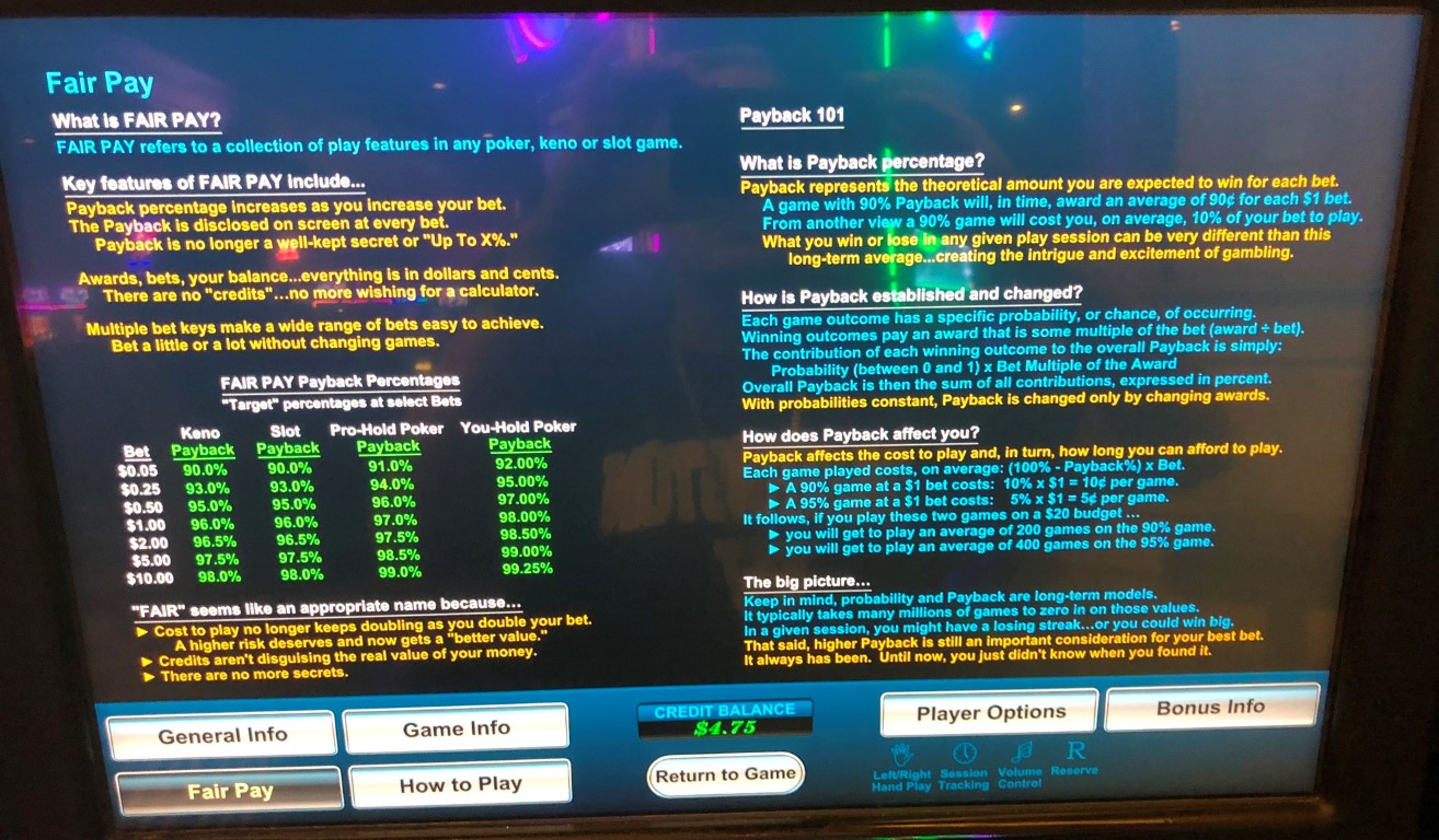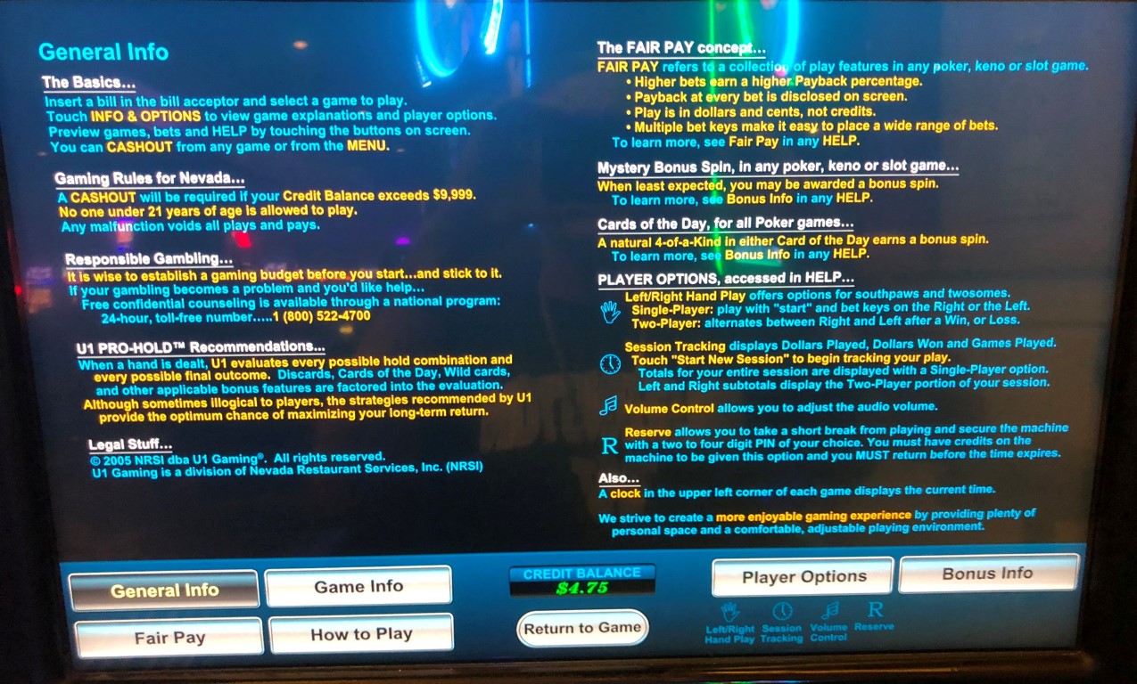 以上收益已在帮助页面中提供。这些收益取自拉斯维加斯 Rampart 赌场的一台机器。U1 告诉我,所有机器在任何投注级别下的收益都相同。不过,他们也补充说,赌场可以通过赔付表配置选择低波动性和高波动性设置。他们表示,大多数赌场都选择低波动性设置。