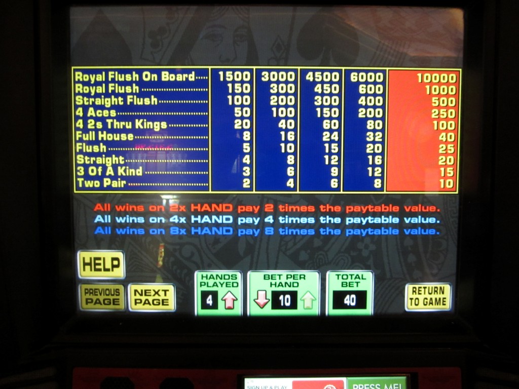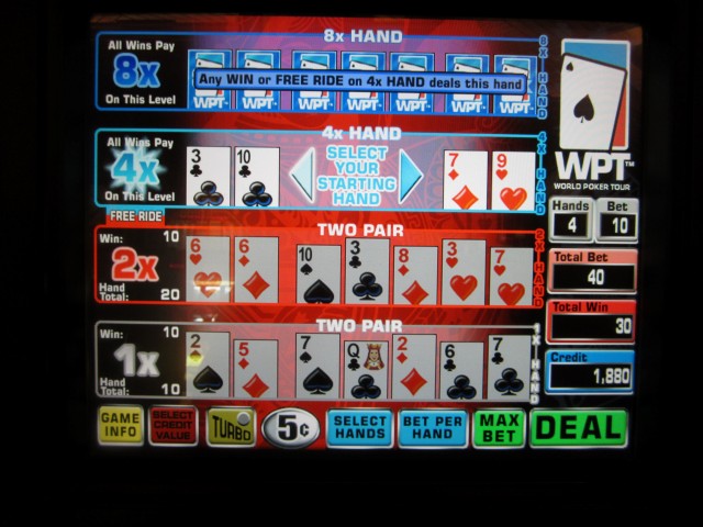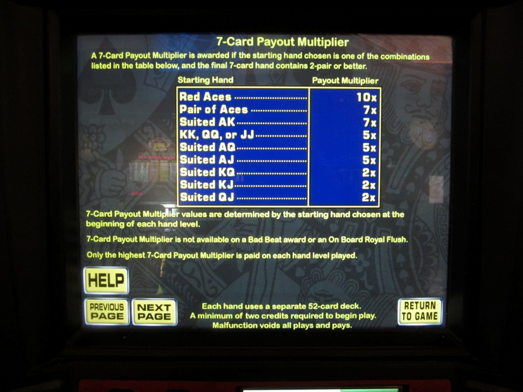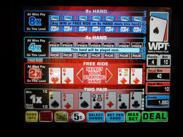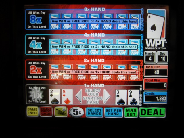 我认为这款游戏创造了赌场游戏最长名称的新纪录:“世界扑克巡回赛多击超级视频德州扑克”。这个名字太长了,所以我就叫它“超级视频德州扑克多击”。我记得它是在2011年末推出的。这款游戏不太容易找到,但我知道截至2012年10月,在咖啡馆附近的红岩赌场有两台机器。这款游戏融合了德州扑克、超级视频德州扑克和多击扑克的玩法。如果这还不够,这里有完整的规则。