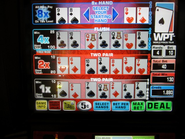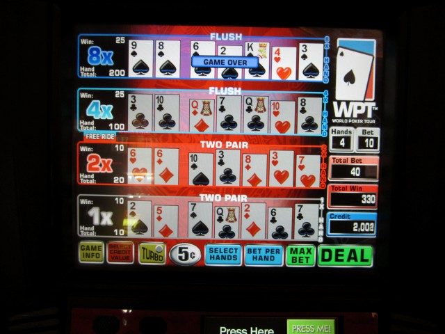 我在第四级拿到了同花,同花的赔率为 2.5 倍,第四级的赔率为 8 倍,这手牌的总赢利为 10 × 2.5 × 8 = 200 个硬币,最终赢利为 330 个硬币。