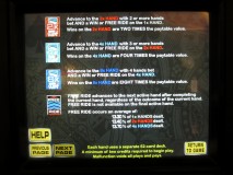 我在第一级拿到了两对,每手牌赢了我10个硬币下注的1倍。我还晋级到了第二级。拍照前,我收到了一张“Free Ride”(免费乘车牌)。证据是,第三手牌的背面写着“Free Ride”,而第三手牌前面的文字写着“接下来玩这手牌”。我的起手牌选择是一对6或同花K10。我选了一对6。