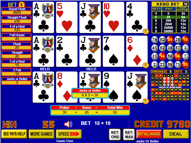 只有最低手牌赢了,也就是一对J。高对的基本赢利是5个积分。加上6倍乘数,我的视频扑克赢利是6×5 = 30。因此,我的总赢利是基诺25个积分 + 视频扑克30个积分 = 55个积分。