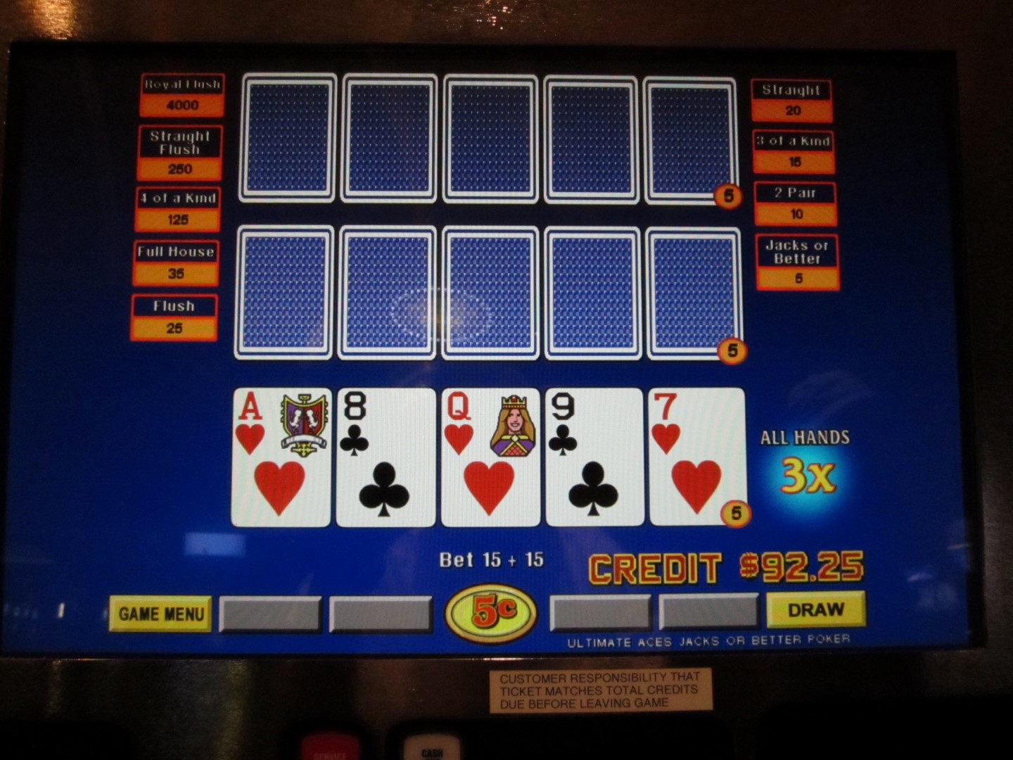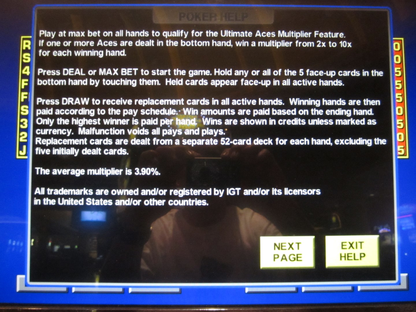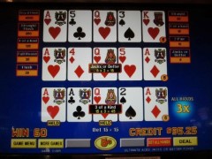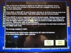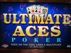 终极王牌扑克(Ultimate Aces Poker)是我在2013年10月在拉斯维加斯阳光海岸赌场(Suncoast casino)发现的一种视频扑克游戏。这款游戏的特色在于,如果玩家至少拿到一张A,就能获得一个乘数。A越多,平均乘数就越大。要使用这项功能,玩家必须加倍下注,而赢取的金额则基于总下注金额的一半。
