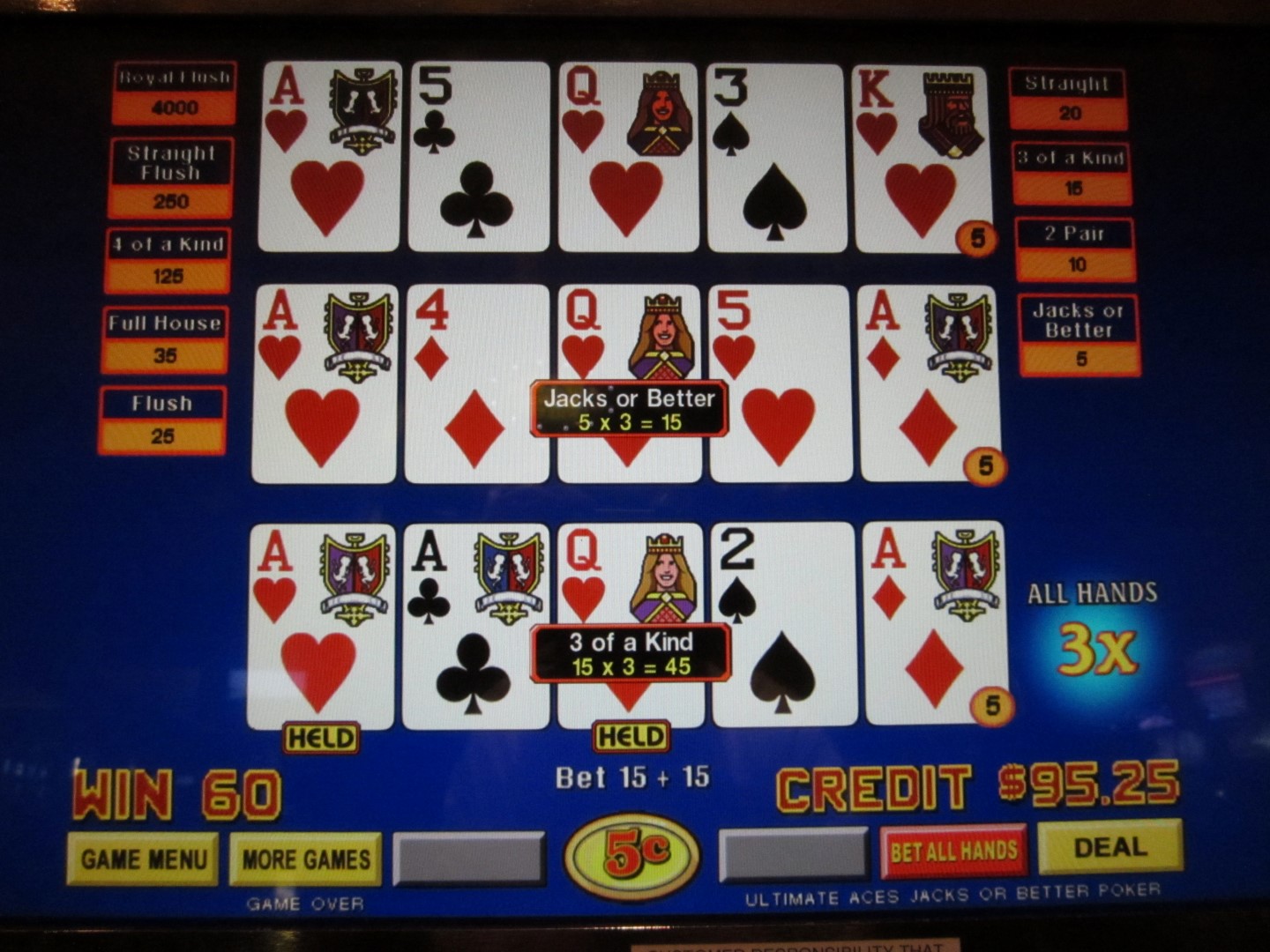 在上面的例子中,我下注了30个筹码,其中3手牌每手5个,另加15个以启用乘数功能。我拿到了红桃A,获得了3倍的随机乘数。第二手牌,也就是抽牌时,我拿到了一对大牌,赔付3 × 1 × 5 = 15个筹码。第三手牌,也就是抽牌时,我拿到了三条,赔付3 × 3 × 5 = 45个筹码。因此,我的总奖金为15 + 45 = 60个筹码。