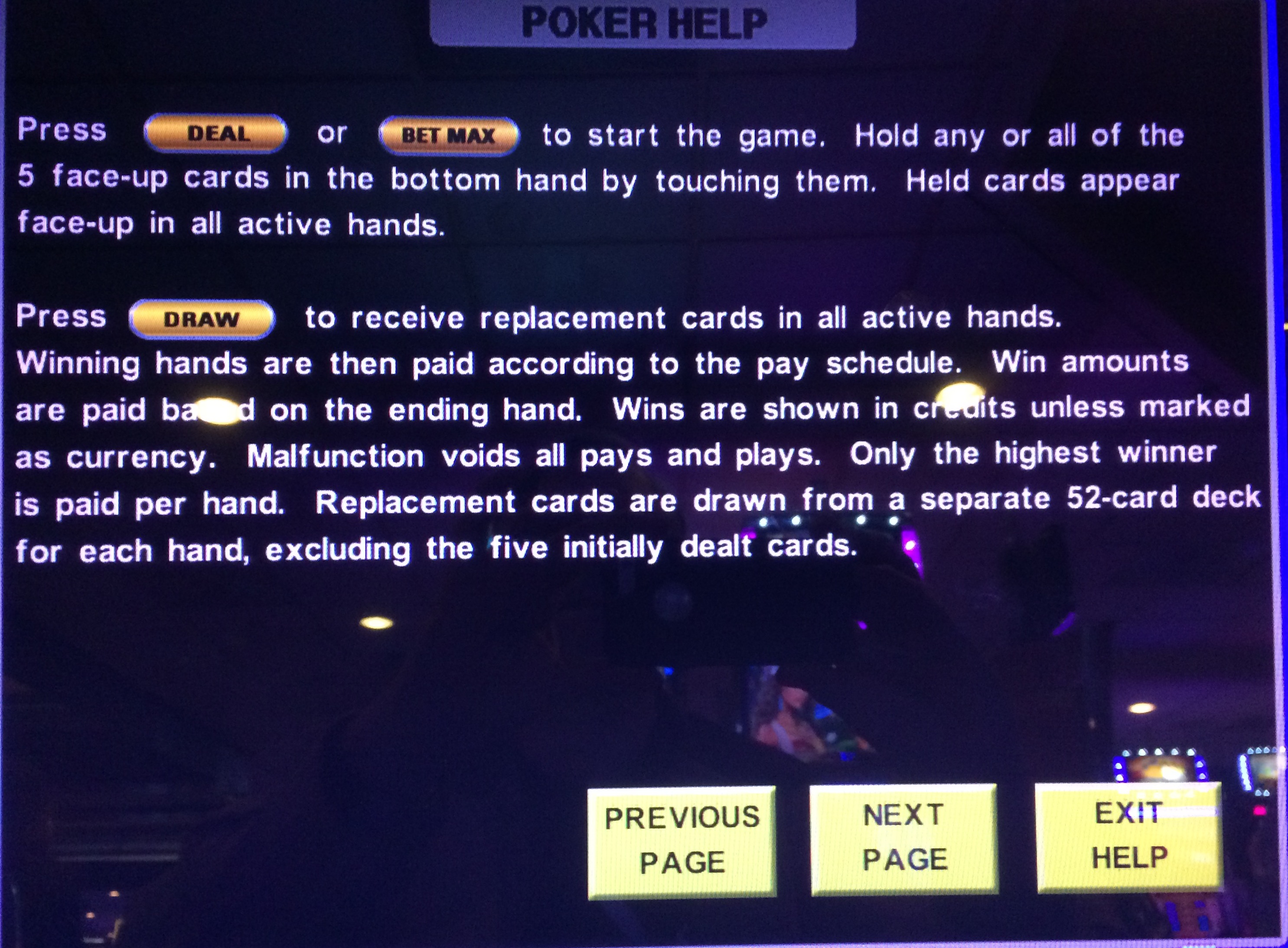 赔付栏指的是那些在赔付表中各不相同的牌型。对于所有没有百搭牌的游戏(双倍奖金除外),赔付栏指的是葫芦和同花的赢利。对于双倍奖金,还会显示顺子的赢利。对于双倍百搭牌,赔付包括皇家同花顺、五条、同花顺、四条、同花和顺子。对于奖金双倍百搭牌,赔付包括同花顺、四条、同花和顺子。每款游戏中的其他赢利均为IGT的标准赢利。