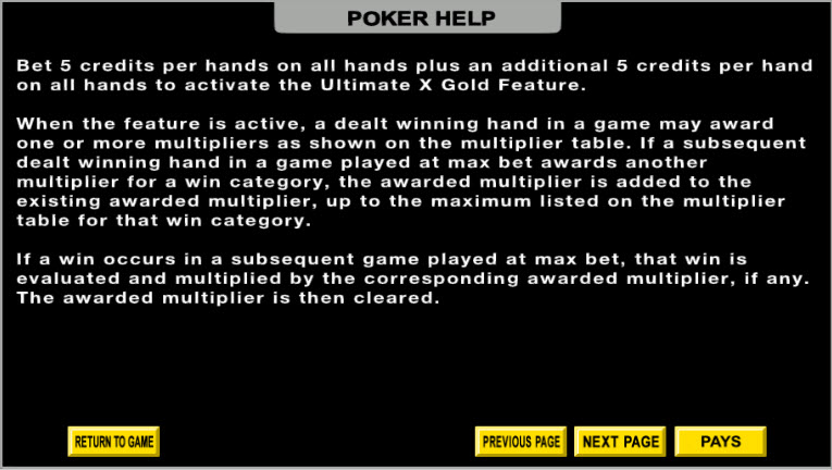 Ultimate X Gold 是 Action Gaming 推出的一款视频扑克游戏。它基于多玩视频扑克,特别是 3 玩法、5 玩法或 10 玩法。如果玩家每手牌在通常的 5 个硬币最高投注额之外额外下注 5 个硬币,即可启用乘数功能。与传统的 Ultimate X 不同,乘数适用于所有手牌,但仅适用于特定赢利,并且有效期至使用为止。