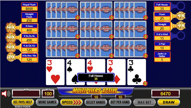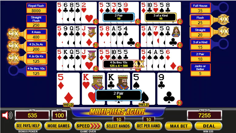 以下是典型的乘数表。此表适用于5次玩法的红利扑克。