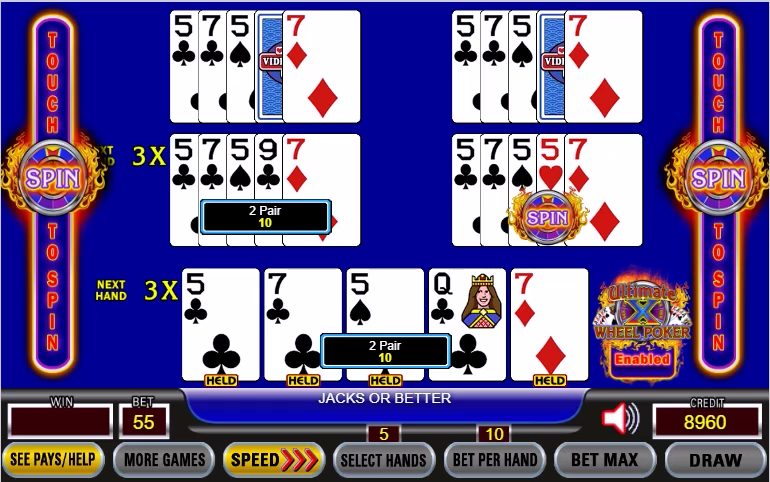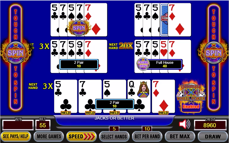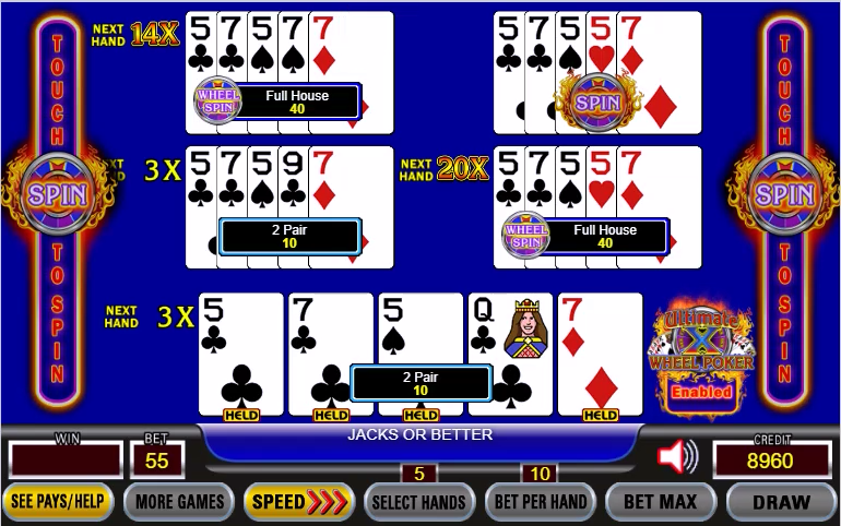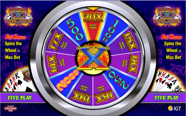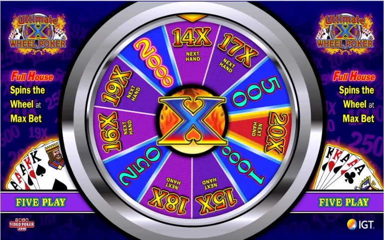 Ultimate X 轮盘扑克与多线 Ultimate X轮盘扑克相同,不同之处在于玩家可以额外下注 5 个筹码(总计,而非每次下注),以替换在非百搭牌游戏中,抽奖时获得葫芦的乘数,并赢得奖励轮盘。在 Deuces Wild 游戏中,同花顺将赢得奖励轮盘。此奖励轮盘提供高额乘数和即时奖金。
