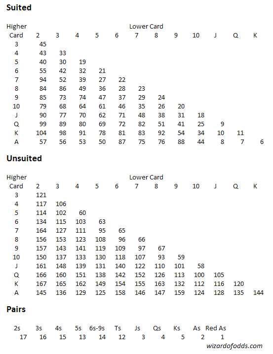 下表显示了超级视频德州扑克赔率表6中所有两张牌类的等级。对于任何给定的初始两张牌类,查找每对牌的强度等级。然后,选择等级较高(或数值较低)的牌。记住,弃牌后的牌会放回牌堆,因此无需担心罚牌例外。预期值列显示该牌类的平均胜率。概率列显示您获得并玩该牌类的概率。回报列是概率与预期回报的乘积。回报之和即为整局游戏的回报,为98.14%。