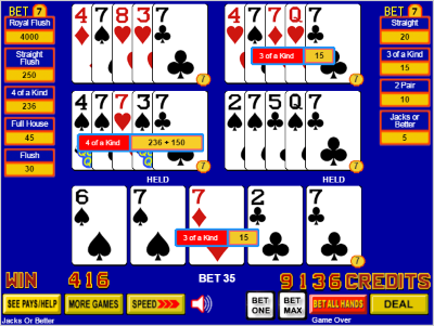 下表显示了一些已知赔付表的概率和回报。赔付列显示最大硬币投注的奖金除以5。平均轮盘奖金也除以5。回报列是奖金、概率和5/7的乘积。乘以5/7的原因是,玩家总投注的2/7是手续费,不会退还。在“Jacks or Better”的回报表中,Quick Quads (QQ) 牌型单独计算。