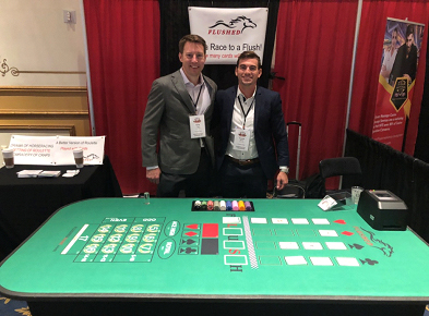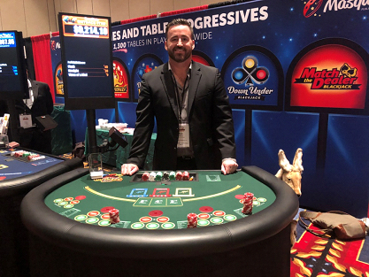 接下来是凯尔·莫里斯 (Kyle Morris) 的最新游戏《Down Under Hold 'Em》。凯尔的所有游戏都使用特殊牌张和镜像读卡器,通过查看牌张来确定其等级是低、中还是高。这款游戏借鉴了密西西比扑克 (Mississippi Stud) 的玩法。它允许玩家根据下一张牌的等级来做出决定。