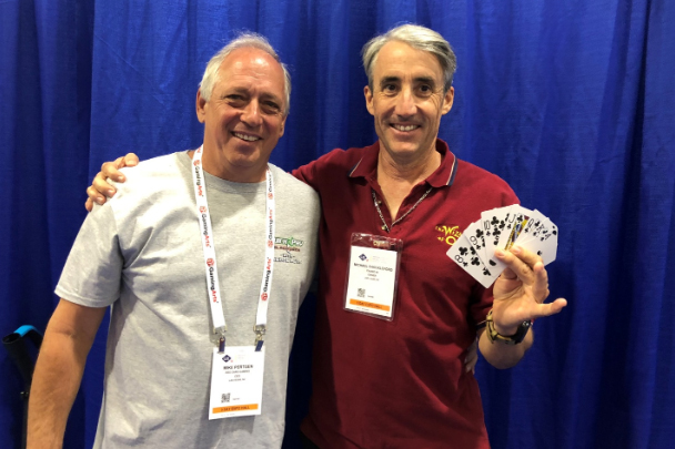 后来,我碰巧遇到了高牌同花的发明者迈克·珀特根。他也是里约酒店的牌九庄家。几乎所有发明游戏的人都会来参加展会,你绝对想不到会碰到你,然后“停下来聊聊天”。