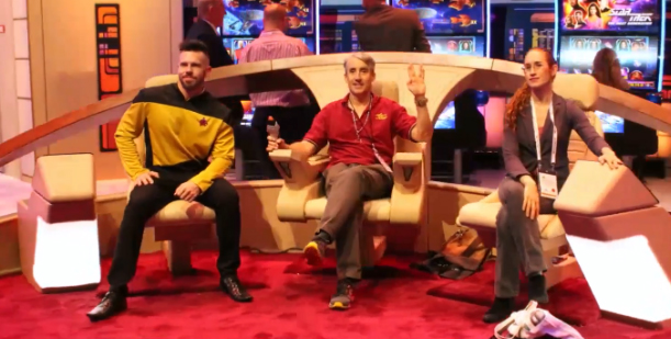 演出最后一天,我和希瑟玩得有点开心。她是《星际迷航》的铁杆粉丝,在我们靠近贵族号的时候,她坚持让我领养一只“Tribble” 。我们还被邀请到舰桥上拍了这张照片。其实是一部短片。猜猜离开舰桥后,是谁把“Tribble”分发给了大家???