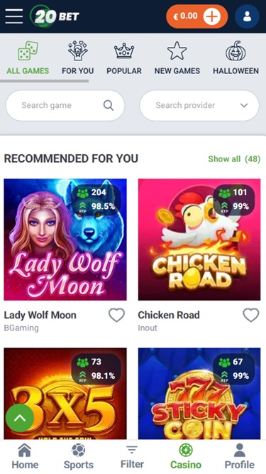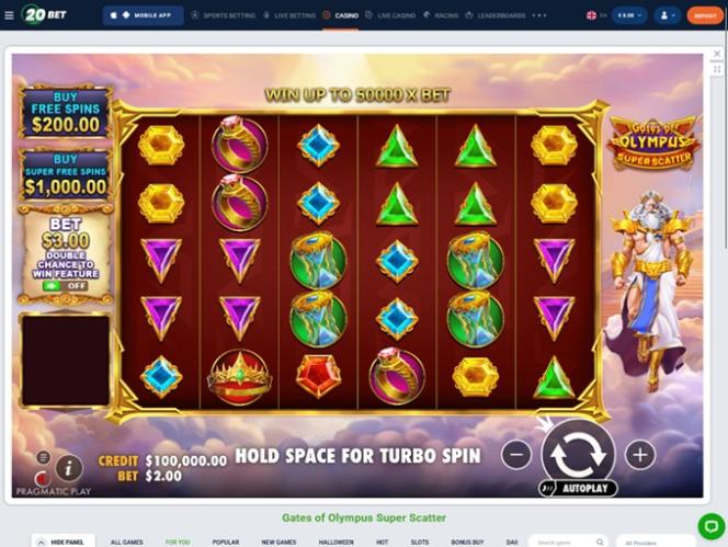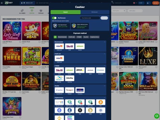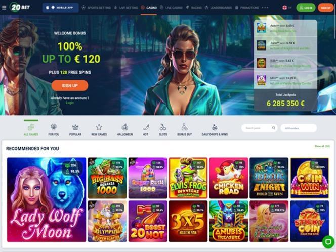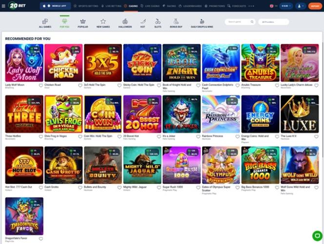 20Bet Casino 由 Microgaming, Net Entertainment, Playtech, BetSoft, 1x2gaming, Amatic Industries, Big Time Gaming, ELK Studios, Evolution Gaming, EYECON, Ezugi, Genesis Gaming, Novomatic, Oryx, Play'n GO, playson, Quickspin, Relax Gaming, Thunderkick, Yggdrasil, Endorphina, Wazdan, GameArt, Booming Games, Pragmatic Play, Nolimit City, Red Tiger Gaming, Booongo, LuckyStreak, Spinomenal, Felix Gaming, Red Rake Gaming, Skillzzgaming, Fugaso, Belatra Games, Fantasma Games, FunFair, Platipus Gaming, Skywind, Spinmatic, Spadegaming, Triple Edge Studios, BGAMING, Northern Lights Gaming, Evoplay, Stormcraft Studios, Switch Studios, OneTouch, Pocket Games Soft, All41 Studios, Gluck Games, Mascot Gaming, TVBet, NetGame Entertainment, Gameburger Studios, Slot Factory, Neon Valley Studios, Golden Rock Studios, Spearhead Studios, Swintt, TrueLab Games, SpinPlay Games, Mancala Gaming, Expanse Studios, 7Mojos, SmartSoft Gaming, KA Gaming, Real Dealer Studios, GONG Gaming, On Air Entertainment, Buck Stakes Entertainment, Caleta Gaming, Games Global, Amusnet Interactive, Ainsworth, Ash Gaming, CT Interactive, EveryMatrix, Greentube, Leander Games, Push Gaming, Tom Horn Gaming, Gamomat, Noble Gaming, BF Games, Bally Wulff, Old Skool Studios, Foxium, Just For The Win, Wild Streak Gaming, Slingshot Studios, Fortune Factory Studios, RubyPlay, AvatarUX, Gamevy, Crazy Tooth Studio, High 5 Games, ReelPlay, Alchemy Gaming, Rarestone Gaming, Indi Slots, Black Pudding Games, Snowborn Games, Boomerang Studios, Hacksaw Gaming, Max Win Gaming, Gold Coin Studios, Gamzix, Triple Cherry, Peter And Sons, Absolute Live Gaming, Aurum Signature Studios, Onlyplay, Gamebeat, Area Vegas, RAW iGaming, Bombay Live, Leap Gaming, TaDa Gaming, Winfinity, 3 Oaks Gaming, Amigo Gaming, Wishbone Games, Spribe, Circular Arrow, 1spin4win, Gaming Corps, BetSolutions, Nailed It! Games, Neko Games, Reel Kingdom, Oros Gaming, JVL, Indigo Magic, Popiplay, Live88, ICONIC21, Galaxsys, Penguin King and Octoplay提供支持,网站采用网页界面,您可以使用互联网浏览器访问。网站设计精良,导航便捷,设有体育博彩、赌场和真人荷官赌场等不同标签页。此外,网站还内置移动端支持,方便您在手机或平板电脑上畅玩。