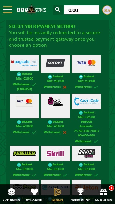 777Stakes 赌场是一家根据马耳他法律注册的在线赌场,由马耳他博彩管理局监管和授权。该品牌的目标市场包括奥地利、德国、芬兰、瑞士、新西兰和巴西,同时也诚邀全球玩家加入。