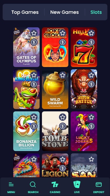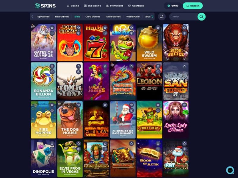 品牌名称说明了一切!77Spins 拥有令人印象深刻的老虎机系列。以下是其提供的一小部分游戏:Gates of Olympus、Hell Hot 100、Ninja、Santa's Gift、Royal Coins 2: Hold and Win、The Dog Hou$e、Book Of Fallen、Wild Pride、Gamblelicious Hold and Win、Royal Wins、Let it Spin、Buffalo Hold and Win、Show Me The Mummy、Paris Nights、Aqua Lord、Temple Tumble、Fire 88、Valley of Pharaohs、Cheeky Monkeys、Octobeer Fortunes、Wolf Gold、The Wild Wings of Phoenix、John Hunter & the Tomb of the Scarab Queen、Lucky Lightning、Books & Bulls、Bonanza、Workshop Wonders Spin Crease、Kluster Krystals、Book Of Demi Gods III、Journey To The West、Fruit Warp、Book of Toro、Million Christmas、Jacks or Better、Book of Souls II: El Dorado、Pyramid King、Adventure Palace Online Slot 等等。