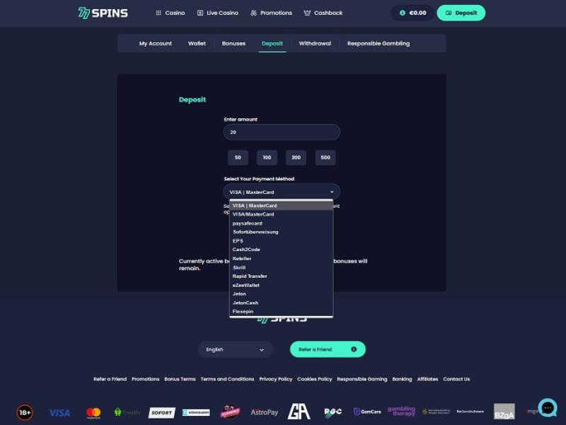 Banking银⾏业务选项 的 77Spins Casino