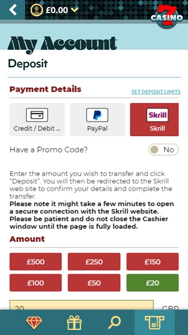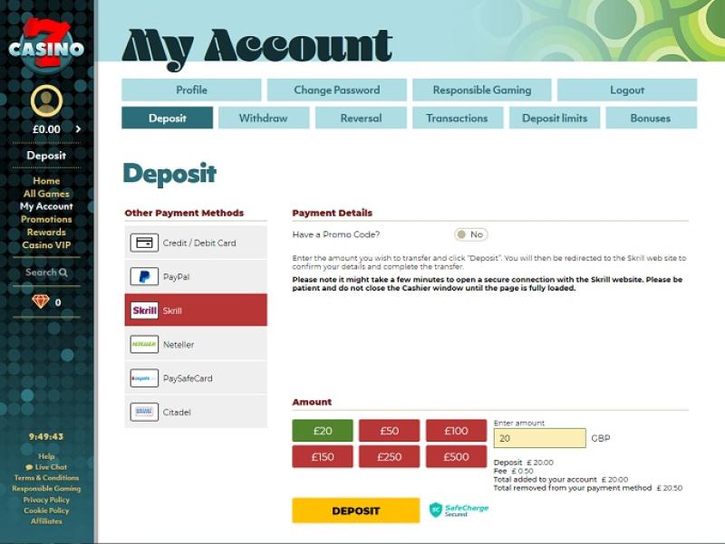 7Casino 的银行服务非常出色,网站支持电子钱包和信用卡交易。首次提款需等待 24 小时,但之后电子钱包即可立即提现。没有提现限额,这点很棒,因为如果您中了累积奖金,应该可以一次性领取。