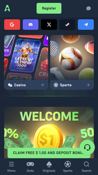 这里设有赌场和体育博彩版块 ,只需点击一下即可轻松切换,而且两个版块的布局都非常清晰。注册新账户也十分便捷,您只需输入电子邮件地址即可加入赌场,或者您也可以使用 Google 账户、X 账户、Telegram 或其他常用账户,这样既节省时间,又能让您立即进入玩家控制面板。