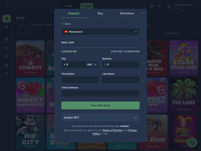 运营商有权自行决定取消任何投注或其任何部分。 赌场可以随时关闭任何账户。 Acebet不允许玩家拥有多个账户。每个家庭只能拥有一个账户。如果玩家创建多个账户,所有投注将被取消,账户将被冻结。 如果总投注金额少于最后一次存款金额,赌场有权拒绝提款。 玩家必须先将存入的资金投注至少一次,才能提出提款申请。 每日中奖金额设有上限。 该赌场支持多种加密货币和法定货币,包括ADA、BRL、BTC、CAD、CNY、DOGE、ETH、EUR、LTC、SOL、TRX、USD、USDC、USDT 和 XRP。