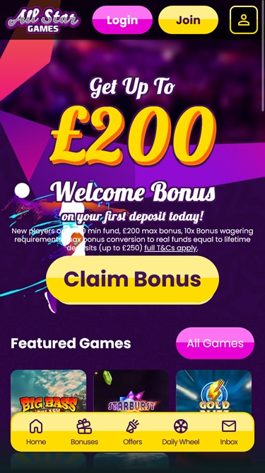 All Star Games 由 Microgaming, Net Entertainment, Playtech, 1x2gaming, Barcrest, Big Time Gaming, ELK Studios, EYECON, lightningboxgames, Oryx, Play'n GO, playson, Quickspin, Rabcat, Saucify, Thunderkick, Yggdrasil, Realistic Games, Booming Games, Pragmatic Play, Nolimit City, Red Tiger Gaming, Spinomenal, Red Rake Gaming, Fantasma Games, Spin Games, Skywind, Triple Edge Studios, Northern Lights Gaming, Fazi, Stormcraft Studios, Switch Studios, Bulletproof Games, All41 Studios, Gluck Games, Gameburger Studios, Pulse 8 Studios, Neon Valley Studios, Golden Rock Studios, Shuffle Master, SpinPlay Games, Real Dealer Studios, GONG Gaming, Blue Guru Games, On Air Entertainment, Buck Stakes Entertainment, Design Works Gaming, Games Global, 2by2 Gaming, Ainsworth, Ash Gaming, Bally Technologies, bluberi, Blueprint Gaming, Jumpman Gaming, Leander Games, Merkur Gaming, NextGen, Tom Horn Gaming, WMS, Inspired Gaming, Gaming Realms, Genii, SG Interactive, Gamomat, Red7Mobile, Scientific Games, Reel Time Gaming, Authentic Gaming, Iron Dog Studio, Old Skool Studios, Foxium, Betdigital, Just For The Win, The Games Company, Storm Gaming Technology, MetaGU, PearFiction Studios, Wild Streak Gaming, Slingshot Studios, Fortune Factory Studios, Jade Rabbit Gaming, 4ThePlayer, AvatarUX, Gamevy, Crazy Tooth Studio, High 5 Games, ReelPlay, Alchemy Gaming, Rarestone Gaming, Snowborn Games, Boomerang Studios, Hacksaw Gaming, Max Win Gaming, Gold Coin Studios, Half Pixel Studios, Peter And Sons, Aurum Signature Studios, Lucksome Gaming, Area Vegas, RAW iGaming, Wishbone Games, HammerTime Games, INO Games, Nailed It! Games, Atomic Slot Lab, Neko Games, Reel Kingdom and Light & Wonder提供支持,赌场游戏通过基于网页的即时游戏平台提供,可直接通过您的网络浏览器加载游戏。该网站还支持移动游戏,您可以使用智能手机或平板电脑进行游戏。