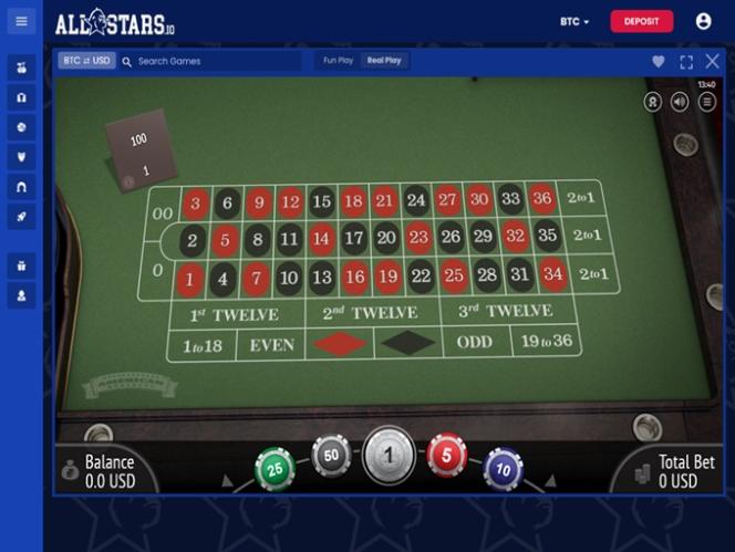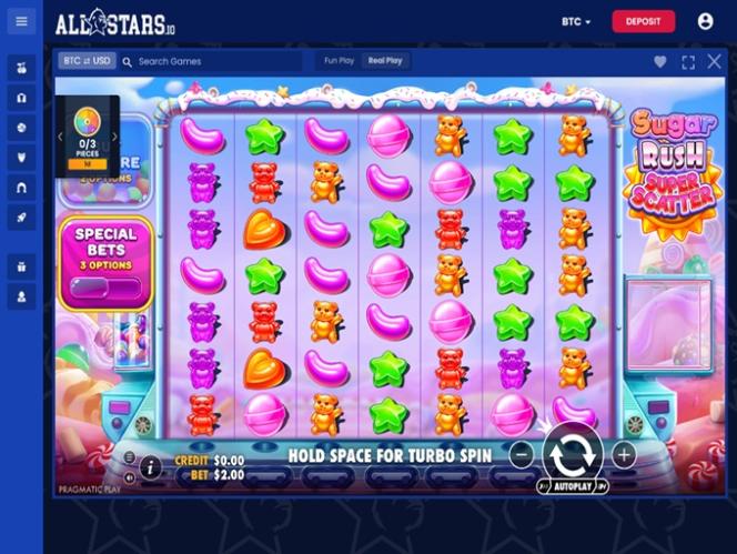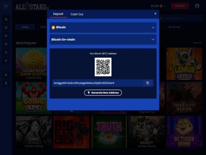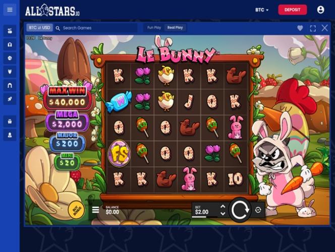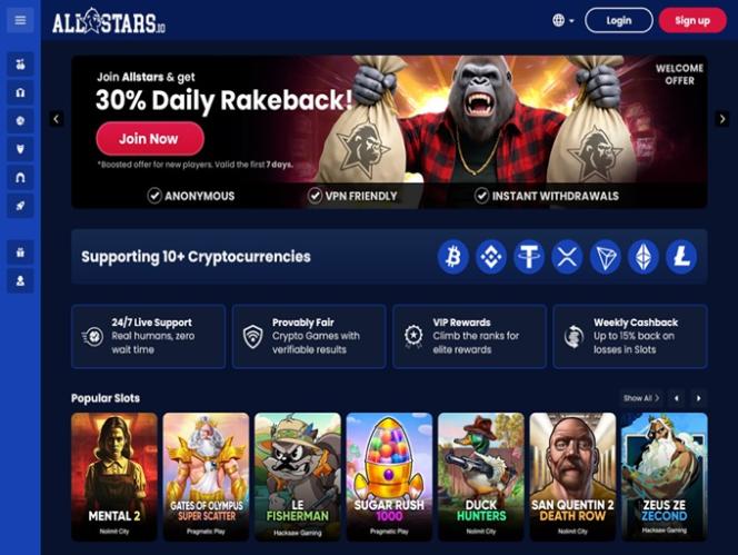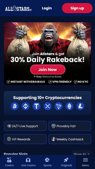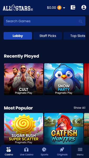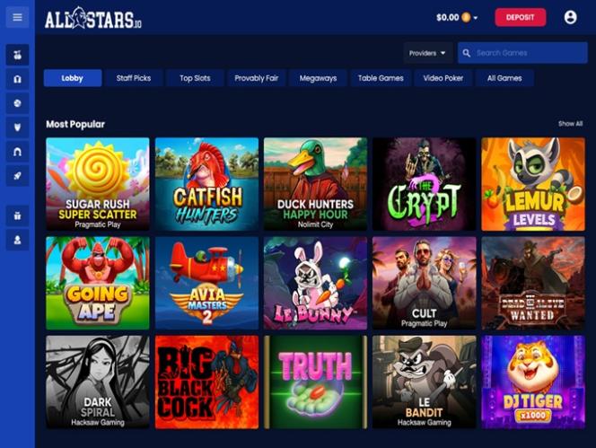 AllStars Casino 以其大胆而充满活力的风格给人留下深刻的第一印象,这种风格似乎是为喜欢多样化游戏的玩家量身打造的。主页上汇集了各种老虎机、刺激的游戏、真人娱乐场、体育博彩市场以及正在进行的促销活动,因此总有精彩内容等着您。它具有现代加密货币赌场的氛围,但浏览起来仍然非常便捷,不会迷失方向。