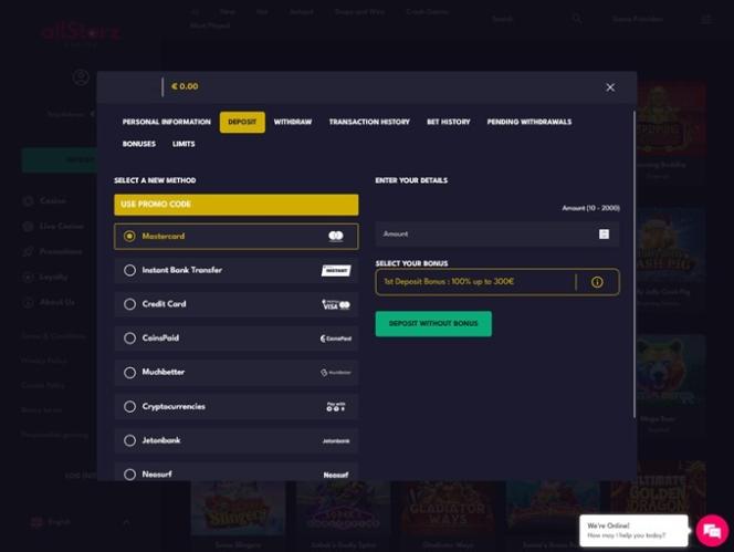 自上线以来,AllStarz 赌场一直致力于为玩家提供绝佳的博彩体验。它提供数千款真钱老虎机、速成游戏、Drops & Wins 游戏、桌面游戏、真人荷官以及丰富的促销和奖金。除了法定货币支付外,该网站还接受各种加密货币,以实现快速支付。