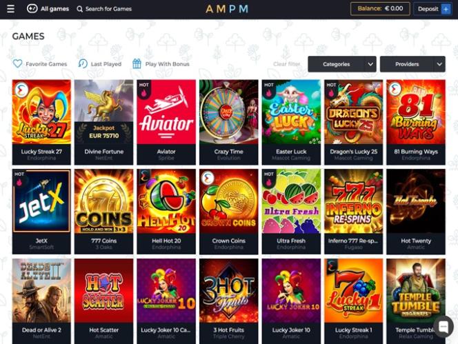 Caleta Gaming 、BetSoft、Evolution、Yggdrasil 等众多在线赌场软件开发商与 AMPM Casino 合作。众多游戏开发商为玩家带来多样性和丰富的游戏乐趣。