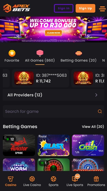 Apex Bets 是一家对南非玩家友好的在线赌场,承诺提供难忘的博彩体验,拥有种类繁多的赌场游戏和体育博彩选项,包括真钱老虎机、真人荷官、桌面游戏和即时崩溃游戏。