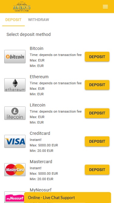 €/$10 (Neosurf)/€/$20 (Credit/Debit Cards)