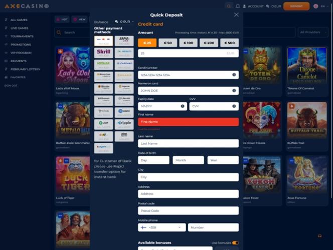 Axe 是一个针对所有可用设备进行优化的在线游戏网站,并且提供可下载版本。注册流程快捷简单,玩家可以立即开始游戏,体验赌场丰富的游戏库。