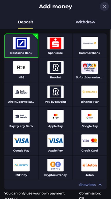 - 根据所使用的付款方式,会产生提款费用。