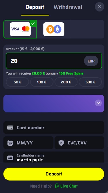 在支付选项方面,您可以选择使用传统支付方式,例如Visa 、 Mastercard 、 Jeton 、 Neosurf 、 Skrill 、 Neteller 、银行电汇、 Astropay等。您也可以选择使用比特币作为主要的银行存款和取款方式。