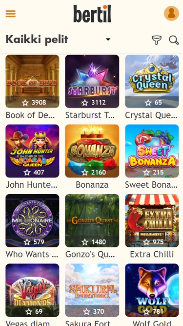 Bertil Casino 由 Microgaming, Net Entertainment, 1x2gaming, Barcrest, Big Time Gaming, ELK Studios, Evolution Gaming, Novomatic, Oryx, Play'n GO, playson, Quickspin, Rabcat, Relax Gaming, Thunderkick, Yggdrasil, Wazdan, Realistic Games, Stakelogic, Pragmatic Play, Nolimit City, Felt Gaming, Red Tiger Gaming, Fantasma Games, Kalamba, Triple Edge Studios, Northern Lights Gaming, Stormcraft Studios, Electric Elephant Games, Bulletproof Games, Gluck Games, Gameburger Studios, Neon Valley Studios, SpinPlay Games, GONG Gaming, Buck Stakes Entertainment, Games Global, 2by2 Gaming, Blueprint Gaming, Greentube, NextGen, Push Gaming, WMS, SG Interactive, Gamomat, Red7Mobile, Scientific Games, Side City Studios, Reel Time Gaming, Iron Dog Studio, Foxium, Betdigital, Just For The Win, Reflex Gaming, Storm Gaming Technology, Wild Streak Gaming, Slingshot Studios, Fortune Factory Studios, STHLM Gaming, 4ThePlayer, AvatarUX, Gamevy, Crazy Tooth Studio, High 5 Games, ReelPlay, Alchemy Gaming, BB Games, Snowborn Games, Boomerang Studios, Hacksaw Gaming, Max Win Gaming, Bang Bang Games, Peter And Sons, Eurostar Studios, Aurum Signature Studios and Lucksome Gaming提供支持,拥有丰富的游戏库,您可以通过网页浏览器直接访问。此外,我们还提供移动网站,方便您在平板电脑和智能手机上畅玩。