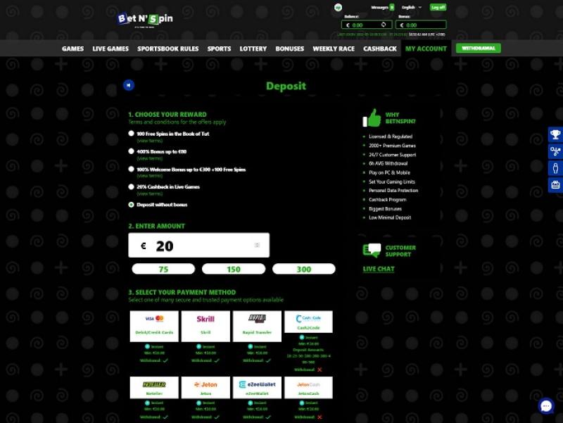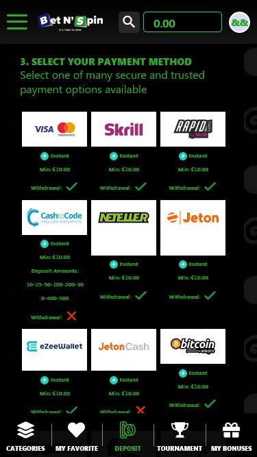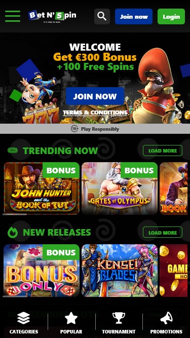Bet N Spin 赌场由 Microgaming, Net Entertainment, BetSoft, 1x2gaming, Big Time Gaming, ELK Studios, Evolution Gaming, Ezugi, Habanero Systems, iSoftBet, Oryx, Play'n GO, playson, Quickspin, Relax Gaming, Thunderkick, Endorphina, Wazdan, Betgames, Booming Games, BetConstruct, Pragmatic Play, Red Tiger Gaming, Booongo, Red Rake Gaming, Inbet Games, Xprogaming, Fugaso, Kalamba, Revolver Gaming, Spinmatic, Spadegaming, Triple Edge Studios, BGAMING, Fazi, Evoplay, Pocket Games Soft, Mascot Gaming, Slot Factory, Spearhead Studios, Swintt, SmartSoft Gaming, KA Gaming, Lady Luck Games, Caleta Gaming, Games Global, Amusnet Interactive, Wizard Games, CT Interactive, NextGen, Pariplay, Push Gaming, Tom Horn Gaming, Genii, Gamomat, Mr Slotty, Apollo Games, Golden Hero, NetGaming, High 5 Games, Hacksaw Gaming, Gamzix, Arcadem, Peter And Sons, Onlyplay and Armadillo Studios提供支持,其游戏通过网页平台提供,可直接通过您的网络浏览器加载。该赌场还全面支持移动端游戏,您可以在智能手机或平板电脑上进行投注。